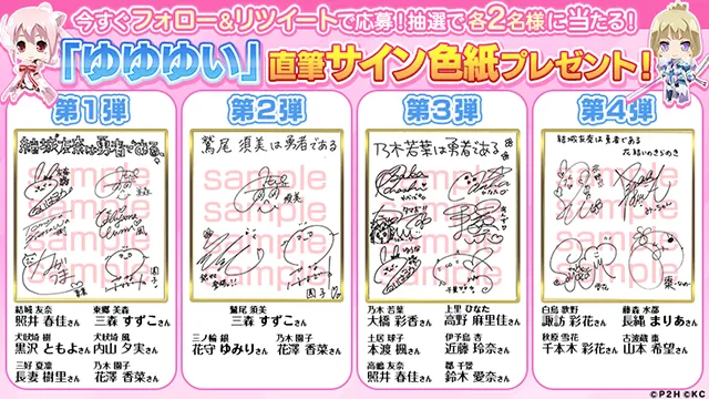 リリース日決定に伴い、現在Twitterにて開催中の、本作品に登場する声優のサイン色紙が当たるプレゼントキャンペーン、第1弾~第4弾の終了日も決定いたしました。