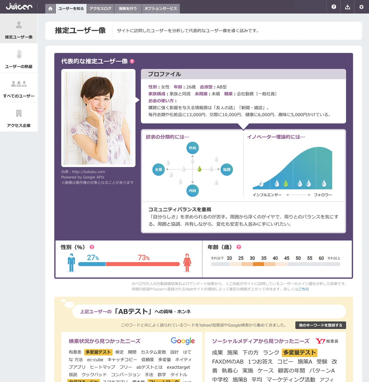 Webサイトを訪れたユーザーを人工知能が自動的に分析し、毎月のお金の使い方や欲求、消費者行動を推定します。