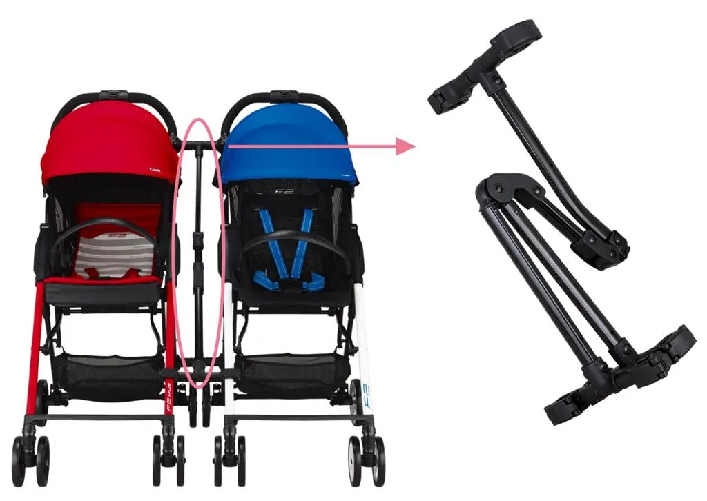 スタイリッシュハイシートベビーカー「F2」および「F2plus」にジョントパーツを使うことで2台をつなげて 走行させることができ、双子やきょうだいで一緒におでかけが可能!