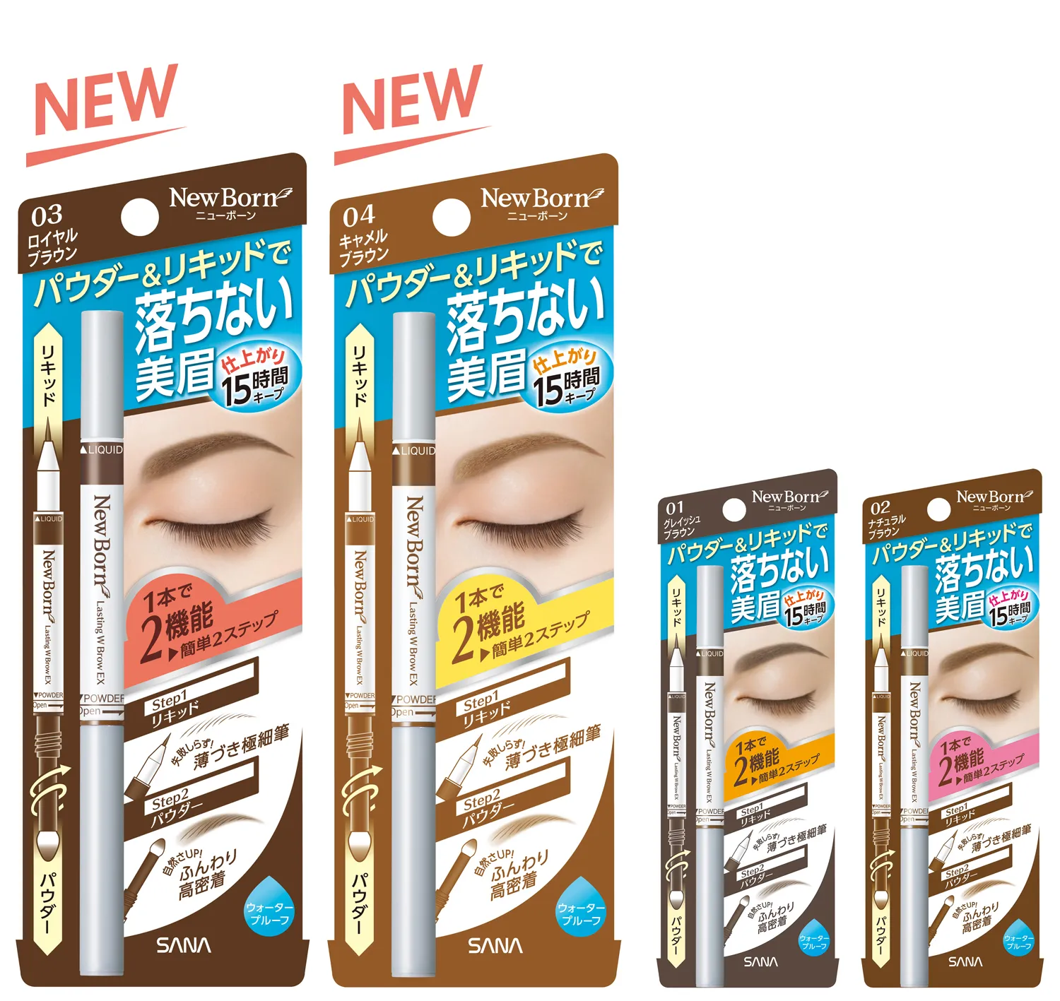ニューボーン ラスティングWブロウEX 03(ロイヤルブラウン)、04(キャメルブラウン)