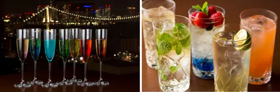 第一ホテル東京シーフォートからの景色の象徴ともいえるレインボーブリッジをイメージした7色のレインボーシャンパン(写真左)は地上100mから眼下に広がる眩い夜景と共にお食事を華やかに彩ります。