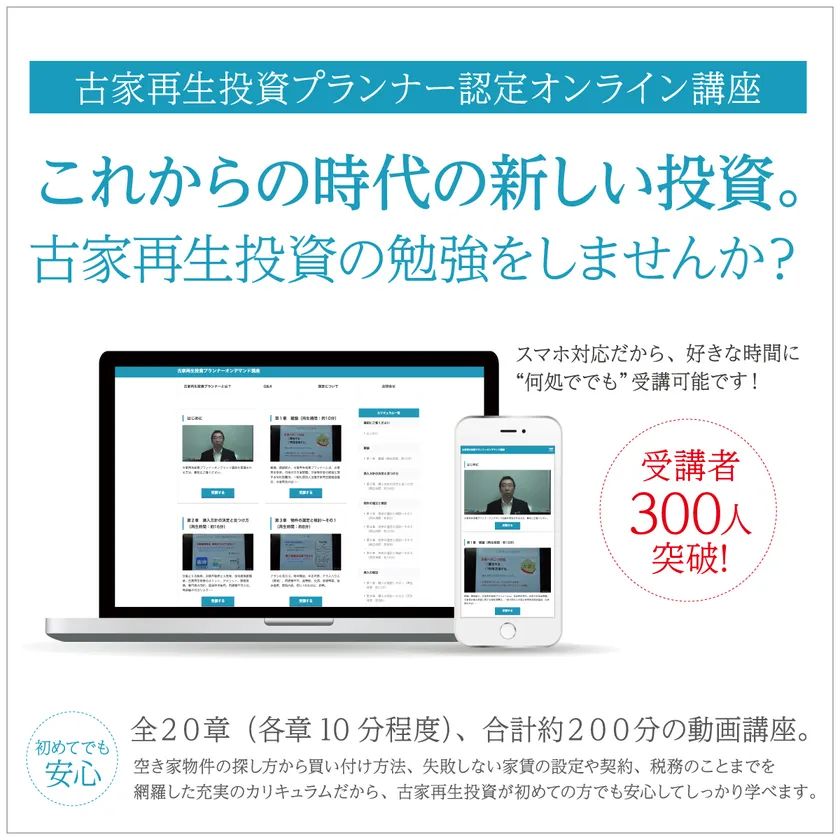 キャンペーン期間中に本ページより「古家再生投資プランナー認定オンライン講座」をお申込いただき、その際にプレゼントの希望をしていただいた方全員に無料で贈呈いたします。さらに、先着50名さま限定で、空き家を購入するまでのリアル体験が綴られたオーナーズインタビュー(別冊版)をプレゼントします。