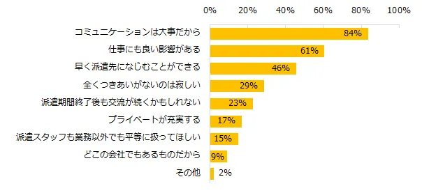 職場で仕事以外の人付き合いはある方が良い派遣社員の方に、その理由を伺いました。第1位は「コミュニケーションは大事だから」(84%)、第2位は「仕事にも良い影響がある」(61%)、第3位は「早く派遣先になじむことができる」(46%)でした。