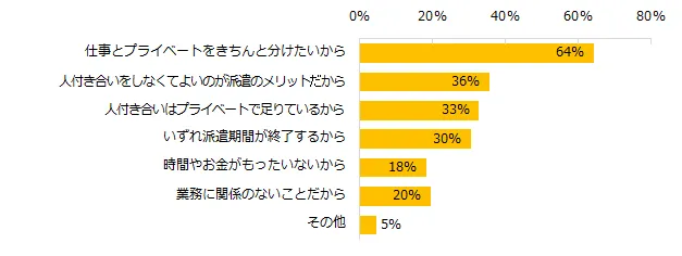一方、職場で仕事以外の人付き合いが無い方が良い派遣社員の方に、その理由を尋ねました。第1位は「仕事とプライベートをきちんと分けたいから」(64%)、第2位は「人付き合いをしなくてよいのが派遣のメリットだから」(36%)、第3位は「人付き合いはプライベートで足りているから」(33%)でした。
