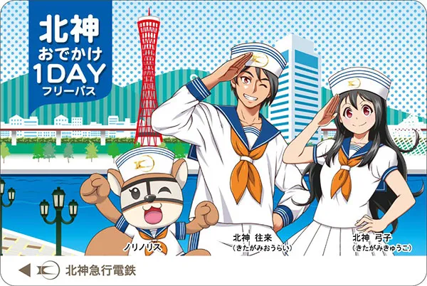 本年は、北神急行電鉄のマスコットキャラクターである北神弓子(きたがみきゅうこ)、北神往来(きたがみおうらい)、ノリノリスが水兵に変身して神戸開港150周年をお祝いする券面デザインとしています。夏は涼風、秋には紅葉が楽しめる郊外やお買い物、初詣などで都心部へのおでかけの際には、ニューフェイスの『北神おでかけ1dayフリーパス』をぜひ、ご利用ください。
