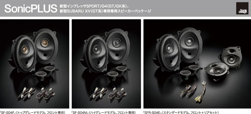 新型SUBARU XVに対応した「SF-S04F」「SR-S04F」(トップグレードモデル)、「SF-S04M」「SR-S04M」(ハイグレードモデル)、「SFR-S04E」(スタンダードモデル)は、スバル車専用設計の高音質スピーカーパッケージです。ソニックデザイン独自のマイクロスピーカー・テクノロジーやフルエンクロージュア方式、エンクロージュア内容積を最大限に確保するための深型オーバル形状(フロント)など、2014 年の発売以来ご好評をいただくSonicPLUS スバル車専用モデルの技術的特徴をすべて継承して、豊かなサウンドと取り付けのしやすさを実現しました。音質的志向やご予算で選べる3 種類のグレードを用意しています。