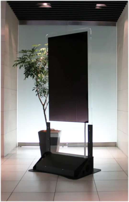 専用薄型スタンドは、ディスプレイとベゼルの薄いイメージを壊さないよう透明のガラスをベースにしています。 また、サイネージ再生用機材は、スタンド下のベース部分に収納されるオールインワン仕様です。