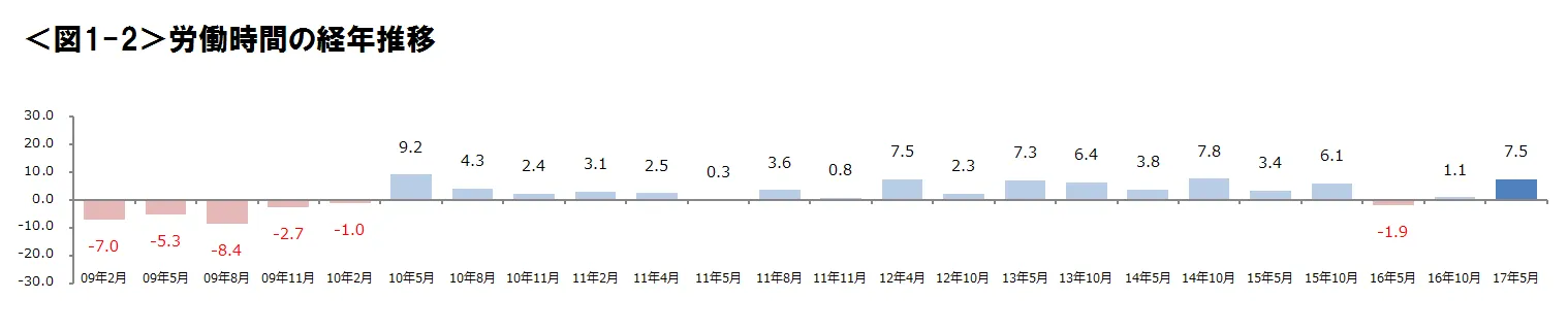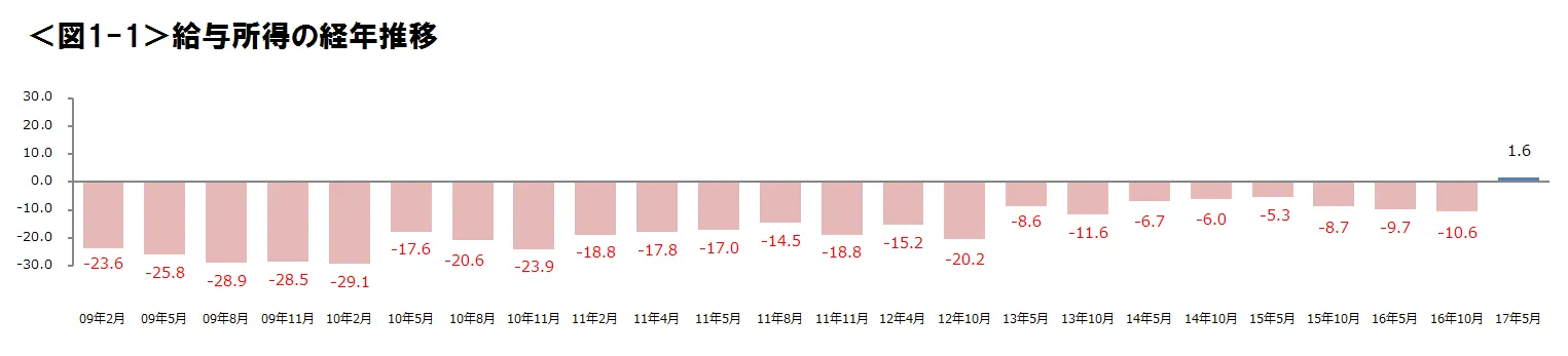 ●給与所得の経年推移をみると、2009年2月の調査開始以来、初めてプラスに転じた。2016年10月に行われた全都道府県の最低賃金の改定があり、改定額が全国平均で初めて800円台(時給)となったことも要因のひとつとして考えられる。一方で、労働時間の経年推移では、2016年5月に減少に転じたものの、依然として増加の状態が続いている。 <図1-1,図1-2>