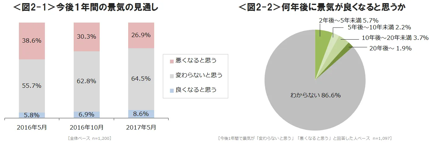 ●今後の景気の見通しでは、「変わらないと思う」が65%で最も多く、「良くなると思う」が9%、「悪くなると思う」が27%となった。前々回の調査(2016年5月)と、前回の調査(2016年10月)と結果を比較すると、わずかではあるが「良くなると思う」が約1~2%ずつ微増しており、景況感指数の上昇がみられた。