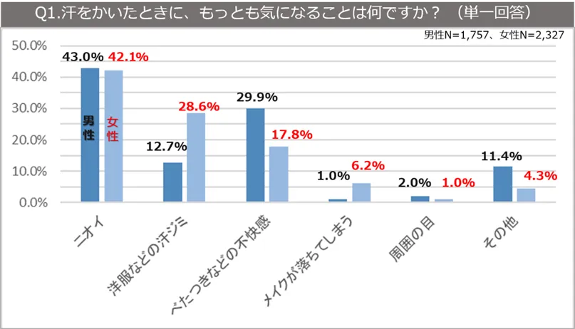 「汗をかいたときに、もっとも気になること」については、男性・女性ともに4割近くが「ニオイ」が気になると一番多く回答がありました。次いで、男性では、「べたつきなどの不快感」と回答した方が、29.9%。女性では、「洋服などの汗ジミ」と回答した方が、28.6%でした。汗をかいたときに、気になる「ニオイ」や、「汗」を抑えてくれる制汗剤。今年も新商品が数多く発売されていますが、どの商品が人気なのでしょう?