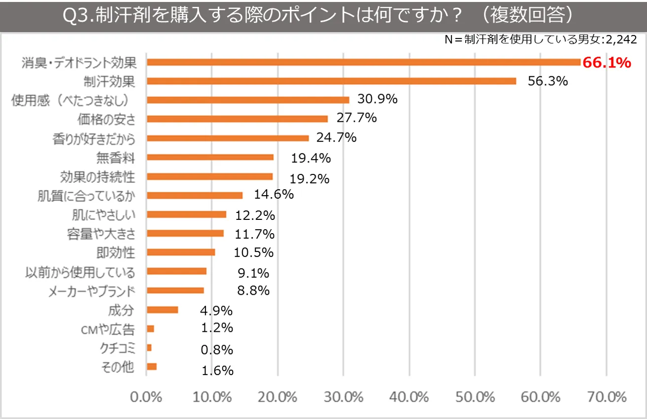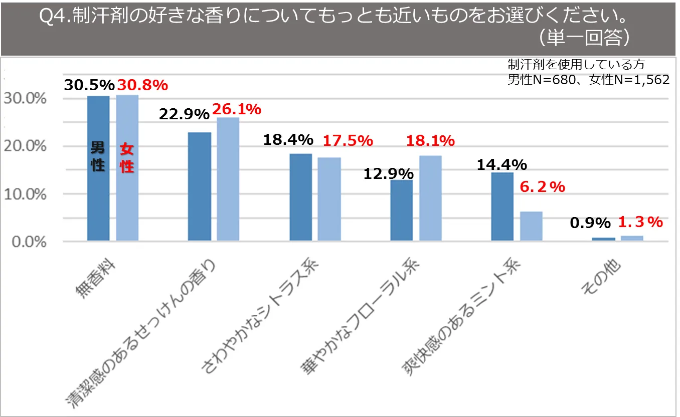 「制汗剤を選ぶポイント」については、66.1%の方が「消臭・デオドラント効果」と回答し、次いで、56.3%の方が「制汗効果」と回答があり、機能性を重視する方が多いことがわかりました。また、「使用感(べたつきなし)」などのテクスチャーや、「香りが好きだから」や「無香料」といった、香りをポイントにする方も多いことがわかりました。制汗剤では、どんな香りが人気なのでしょうか?