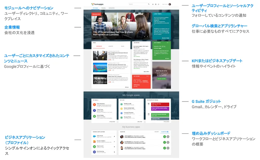 LumApps は、Google より2016年で功績のあるソリューションに送られる Global Partner Award 2016 “Solution Innovation Award” を受賞した、G Suite(TM) 連携型CMS(コンテンツマネジメントシステム)です。フランスのリヨン、パリ、ロンドン、ニューヨーク、サンフランシスコに拠点を持ち、世界各国に導入実績があります。G Suite のコアサービスである Gmail(TM)、Google ドライブ、カレンダー、サイトに連携し、20種類以上あるガジェットを組み合わせることで、企業内のあらゆる情報を集約したポータルサイトを簡単に作成・管理することが可能です。