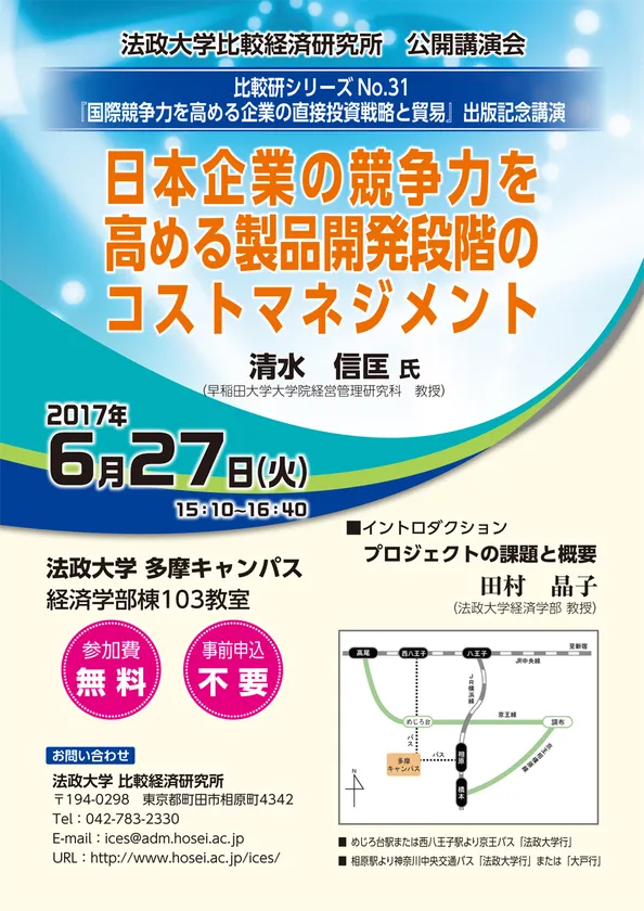2017年6月8日 10:00法政大学比較経済研究所は2017年6月27日(火)に公開講演会「日本企業の競争力を高める製品開発段階のコストマネジメント」を開催します(参加費無料、事前申込不要)。