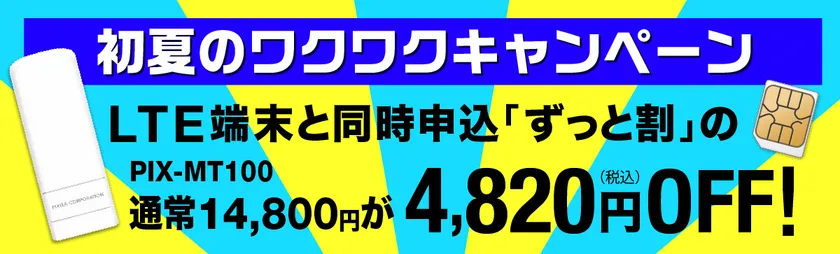 「ピクセラモバイル 高速定額SIM LTE端末セット同時申込」を、キャンペーン期間中にお申し込みいただくと、通常14,800円(税込)で販売しているLTE端末「PIX-MT100」を9,980円(税込)で提供します。