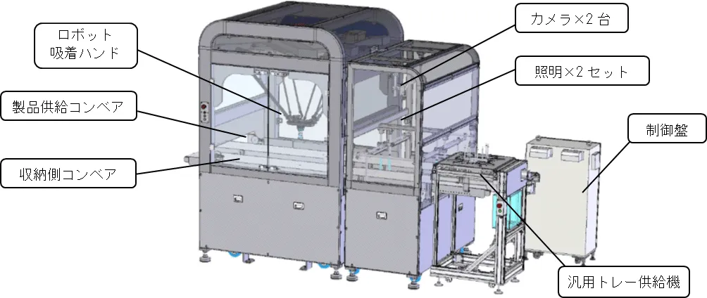 ・優れたダブルトラッキング性能(製品搬送コンベアとトレー搬送コンベアの2つの搬送を同時に補正してピッキングする性能)を有します。