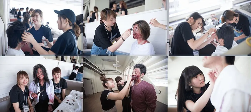 今回のイベントにてヴィーナスアカデミーのビューティスペシャリスト学部トータルビューティベーシック学科の学生27名が、イベントに応募した一般の方へのゾンビ特殊メイクを担当しイベントを盛り上げました。メイクを受けた方々からは「持参した衣装に合わせて、学生が特殊メイクの提案をしてくれました。自分では到底できない特殊メイクのクオリティの高さに満足しています」との声もありました。