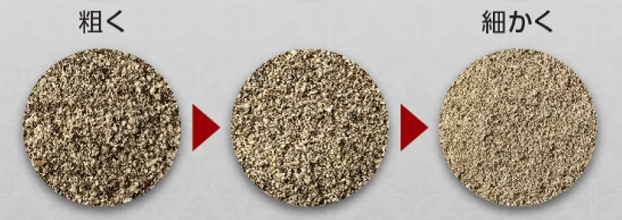 粗さ調整機能が付いており、ツマミを左右に回すだけで、料理に合わせてお好みの粗さに挽いていただけます。
