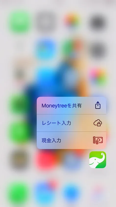 iOS版では、「3D Touch」に対応しました。「3D Touch」とは、画面を押す深さに応じてオプションを表示できるようになるiPhone 6s以降の機能です。Moneytreeのアイコンを強く押すと、以下のオプションが表示されます。