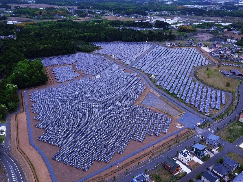 春の木ソーラー発電所は、茨城県水戸市鯉淵町に立地し、出力8.8MW、敷地面積は約15万平米で30,000枚を超える太陽光パネルが並んでいます。