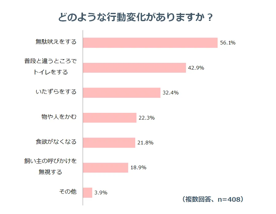 お散歩に行けない日が続くことで、愛犬の行動が変わると回答した割合は、全体の47.4%にのぼりました。行動の変化の内容としては、「無駄吠えをする」「普段と違うところでトイレをする」「いたずらをする」「人や物を噛む」「飼い主の呼びかけを無視する」などのように、ストレスを示す行動変化が多くありましたが、「食欲がなくなる」など体調に影響があるという回答も一定数ありました。