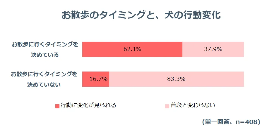 お散歩のタイミングを特に決めていない飼い主さまと、お散歩に行く時間や頻度などを決めている飼い主さまとでは、「お散歩に行けなかったときに愛犬の行動が変化する」と回答した割合が、全く異なることがわかりました。普段からお散歩に行くタイミングが決まっていない犬の場合、何かしらの行動変化がある割合が37.9%である一方、タイミングを決めてお散歩に行っている犬の場合は、その割合が83.3%に上ります。