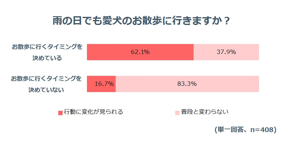 「雨の日でもお散歩に行く」という回答は、全体の61.0%を占めました。この中には「雨の日が続いた場合は行く」「雨の程度によっては行く」という条件付きの回答も含まれるのですが、「必ず行く」と答えた回答も30%近くありました。