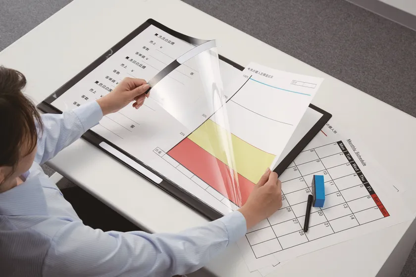 「罫線がカスタマイズできる掲示ボード」は自分で作成した表や罫線を印刷した紙をフィルムに挟み、フィルム上からホワイトボードのように自由に書き消しが出来るので、簡単かつ綺麗に独自の掲示ボードを作成することができます。
