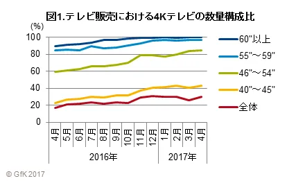 4Kテレビ販売は、2017年も好調に推移しており、1-4月では数量前年比76%増、金額前年比40%増となった。同期間のテレビ販売における4Kテレビの構成比は、数量ベースで28%(前年同期16%)、金額ベースで57%(前年同期42%)に達した。