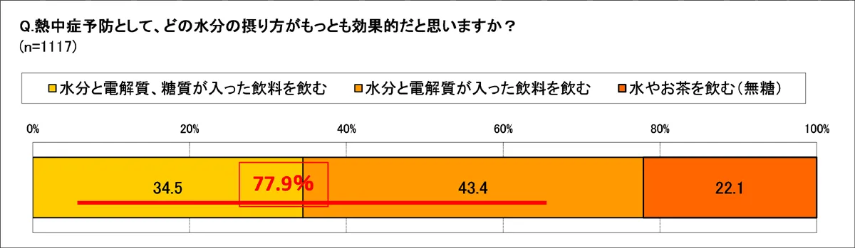 「熱中症対策として、どの水分のとり方がもっとも効果的だと思いますか?」には「水分と電解質が入った飲料を飲む」43.4%、「水分と電解質、糖質が入った飲料を飲む」34.5%が、「水やお茶を飲む(無糖)」22.1%をおさえて上に。「電解質」を含む飲料が効果的と知っている人が4人中3人以上いることになります。