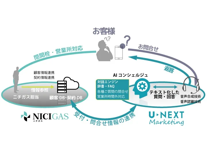 第一ステップとして、ニチガスとU-NEXTマーケティング(以下「両社」)は、ニチガスのLP事業におけるお客さま向けの応対業務に『AIコンシェルジュ』サービスを導入し、開栓・閉栓作業、緊急時対策、料金問い合わせなどのお客さまの一次受付を自動で行い、関連部門、営業担当者など必要部署への情報連携の自動化を実現いたします。