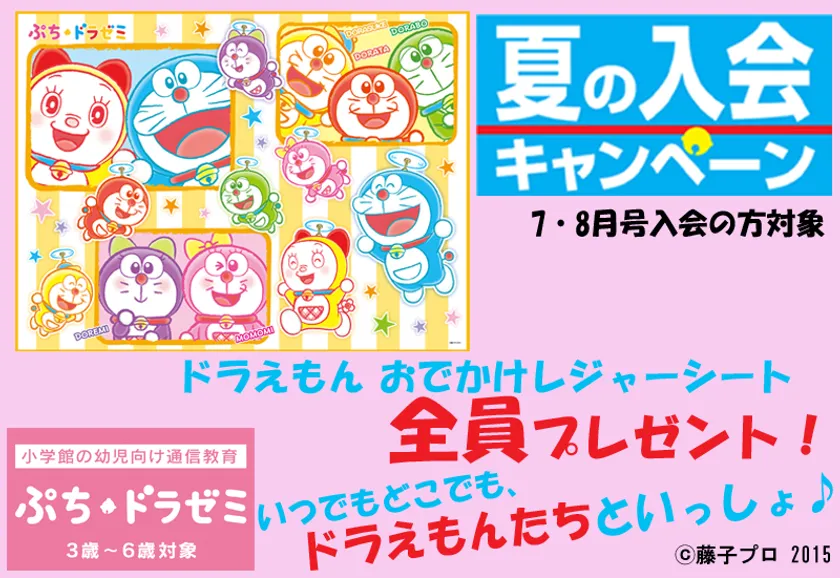 また、ドラゼミでは夏休みの学習提案の一環として、「2017年度 夏の入会キャンペーン」を実施しており、7月号・8月号から小学生コースに新規で入会された方には、「夏休み学習おうえんセット【(1)てっていはんぷく!計算プリント (2)おたのしみ!作文プリント】」をお届けしています≪最終締切:2017年8月21日(月)≫。同期間にぷちドラゼミに新規で入会された方には、ぷちドラゼミオリジナルの「ドラえもん おでかけレジャーシート」をお届けいたします。
