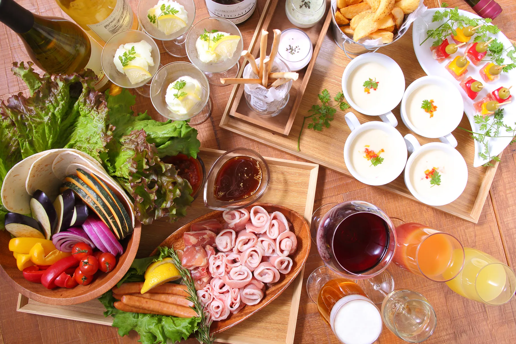 前菜はイソフラボンたっぷりの冷製豆乳スープ、近江野菜と生ハムのピンチョスなど。メインはご自身で焼いていただくBBQスタイルで、朝採れ近江野菜やポークをご提供。お好きな具材をご自身で包むトルティーヤ、野菜を使用したシャーベットなど、〆までお楽しみいただけます。