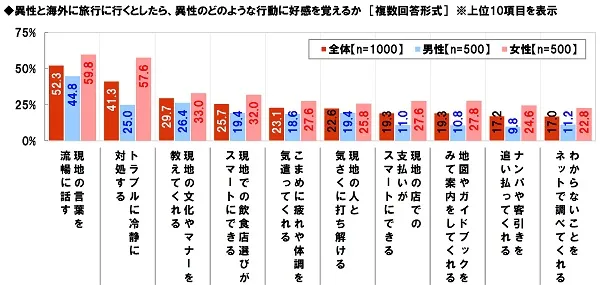 全回答者(1,000名)に、異性と海外に旅行に行くとしたら、異性のどのような行動に好感を覚えるか聞いたところ、「現地の言葉を流暢に話す」が52.3%で最も多く、次いで、「トラブルに冷静に対処する」41.3%、「現地の文化やマナーを教えてくれる」29.7%、「現地での飲食店選びがスマートにできる」25.7%、「こまめに疲れや体調を気遣ってくれる」23.1%が続きました。スマートさや気遣いの気持ちがあらわれた振る舞いに好感を覚えるという人が多いようです。
