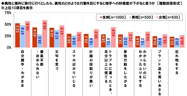現地の言葉が話せ、トラブル時にも冷静で、スマートさが備わっている相手に好感を覚える人が多いことがわかりましたが、逆に、相手への好感度が下がる行動とはどのようなものなのでしょうか。全回答者(1,000名)に、異性と海外に旅行に行くとしたら、異性のどのような行動を目にすると相手への好感度が下がると思うか聞いたところ、「自分勝手・わがまま」が52.3%で最も多く、次いで、「優柔不断・決められない」が43.4%、「文句を言う」が42.6%、「スマホばかりいじる」が29.7%、「計画の段取りが悪い」が29.3%で続きました。海外旅行デートでは、自分勝手な行動だけでなく、優柔不断な態度や、文句を言うといったことは禁物のようです。