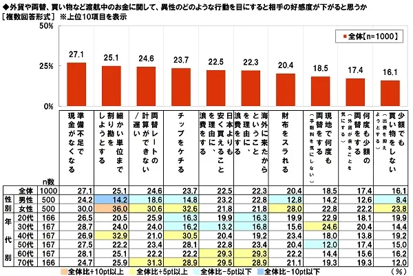 また、全回答者(1,000名)に、外貨や両替、買い物など渡航中のお金に関して、異性のどのような行動を目にすると相手への好感度が下がると思うか聞いたところ、「準備不足で現金がなくなる」が27.1%で最も多く、次いで、「細かい単位まで割り勘をしようとする」25.1%、「両替レートの計算ができない/遅い」24.6%、「チップをケチる」23.7%、「日本よりも安く買えることを理由に、浪費をする」22.5%が続きました。海外旅行では、思っていた以上に費用がかかってしまうことが多いため、旅行中に現金が不足し、パートナーをガッカリさせないためにも、外貨の準備をしっかりしておくとよさそうです。
