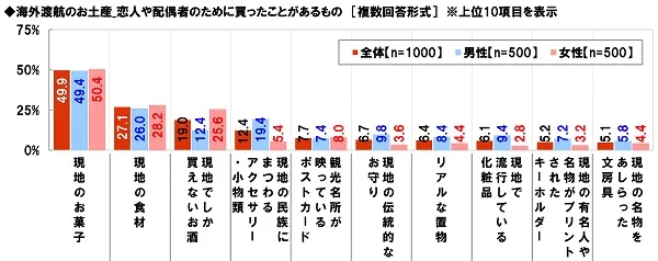 また、恋人や配偶者のために買ったことがあるものを聞いたところ、1位「現地のお菓子」49.9%、2位「現地の食材」27.1%、3位「現地でしか買えないお酒」19.0%、4位「現地の民族にまつわるアクセサリー・小物類」12.4%、5位「観光名所が映っているポストカード」7.7%となりました。上位5位までは自分のために買ったお土産と同じランキングになりましたが、現地の味をパートナーと一緒に楽しもうとしていた人が多いのではないでしょうか。