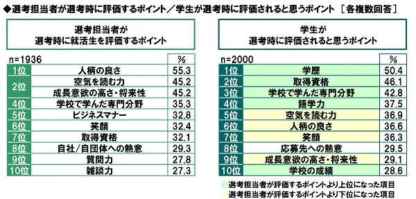 ◆選考担当者が評価するのは「人柄」「空気を読む力」、学生の考えと選考担当者評価ポイントに大きなギャップ