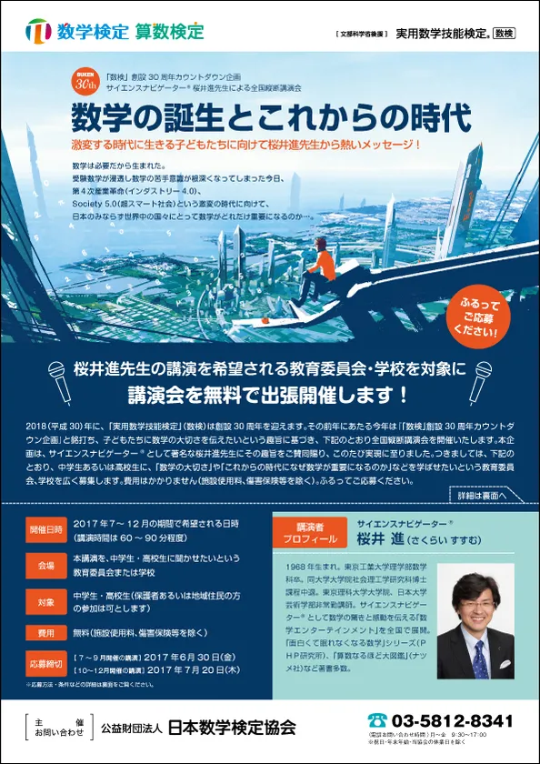 2017年6月16日 14:00公益財団法人日本数学検定協会(所在地:東京都台東区、理事長:清水静海)は、「『数検』創設30周年カウントダウン企画」として2017年7月から12月までの6か月間で「サイエンスナビゲーター(R)桜井進先生による全国縦断講演会」を開催いたします。