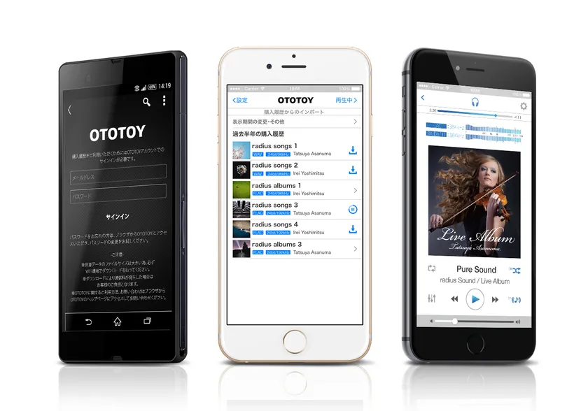 ハイレゾ音源配信サイト「OTOTOY」で購入した音源を、NePLAYER・NePLAYER Liteに直接ダウンロードができるようになりました。NePLAYER・NePLAYER Liteから「OTOTOY」にサインインするだけの簡単な操作で、曲の購入履歴を確認・ダウンロードが可能です。パソコンを使わなくてもハイレゾ音源を含む音楽データをNePLAYER・NePLAYER Liteがあればスマホに直接保存してすぐに聴くことができます。