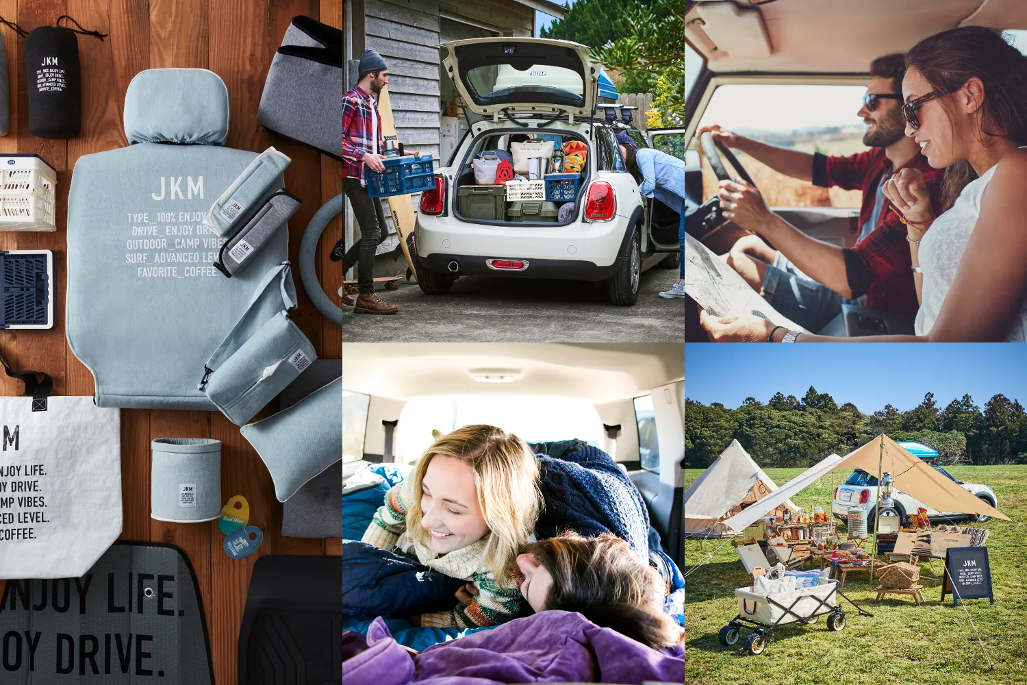 ■JKMは、「心躍るカーライフを車内も出先もカッコよく」をテーマに、「パッキング」「積み込む」「移動中も妥協しない」「車中泊」「サイトでCafeスタイル」を提案します。