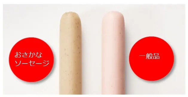 一般的にすり身に多く使用されるリン酸塩(※)や着色料、化学調味料は不使用。右写真の右側の魚肉ソーセージは着色料を使用したもの。左側のらでぃっしゅぼーやの「おさかなソーセージ」は着色料不使用なので、魚そのものの色です。