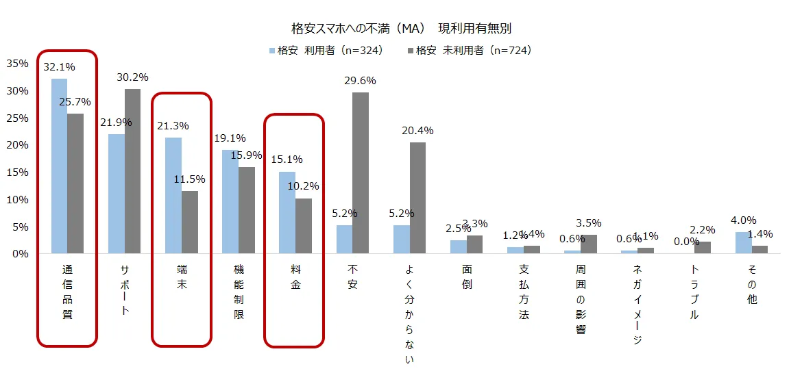 格安スマホ利用者の不満では「通信品質」が最多。