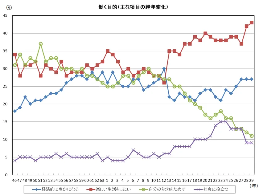 ●「働く目的」では「楽しい生活をしたい」が過去最高を更新(一昨年度37.0%→昨年度41.7%→42.6%)し、「自分の能力をためす」は過去最低を更新(13.4%→12.4%→10.9%)。「社会に役立つ」も減少傾向(12.5%→9.3%→9.2%)。