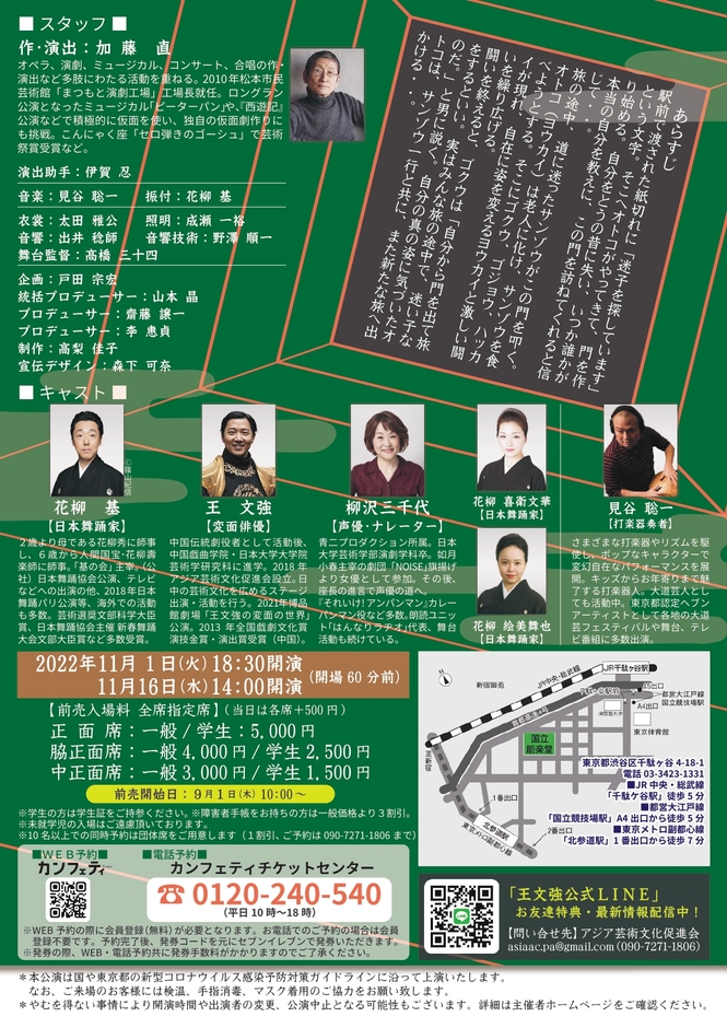 一般社団法人アジア芸術文化促進会(代表:王 文強/プロデューサー:山本 晶、以下「当促進会」)は、今年2022年に日中国交正常化50周年の節目を迎える記念公演として、日本舞踊と変面の日中両国の伝統芸能に、現代的な語りの要素を加えた新しい舞台、【〜能舞台で繰り広げる「西遊記奇聞」〜『みんな迷い子』】を、今秋国立能楽堂で上演します。