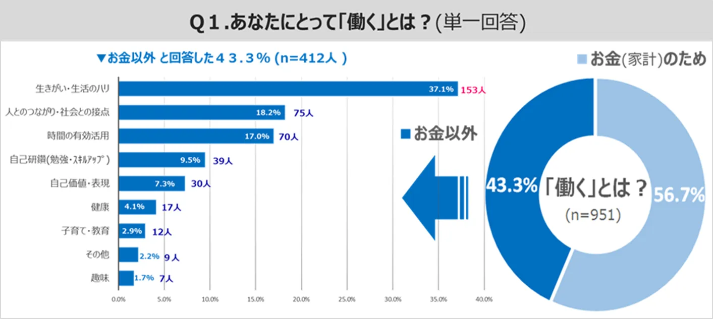 「お金以外」と回答をした43.3%の内訳は、37.1%が「生きがい・生活のハリ」と最も多く、ついで18.2%「人とのつながり・社会との接点」、17.0%「時間の有効活用」、9.5%「自己研鑽(勉強・スキルアップ)」、7.3%「自己価値・表現」となりました。では、具体的にどのような点でそう感じているのでしょうか。