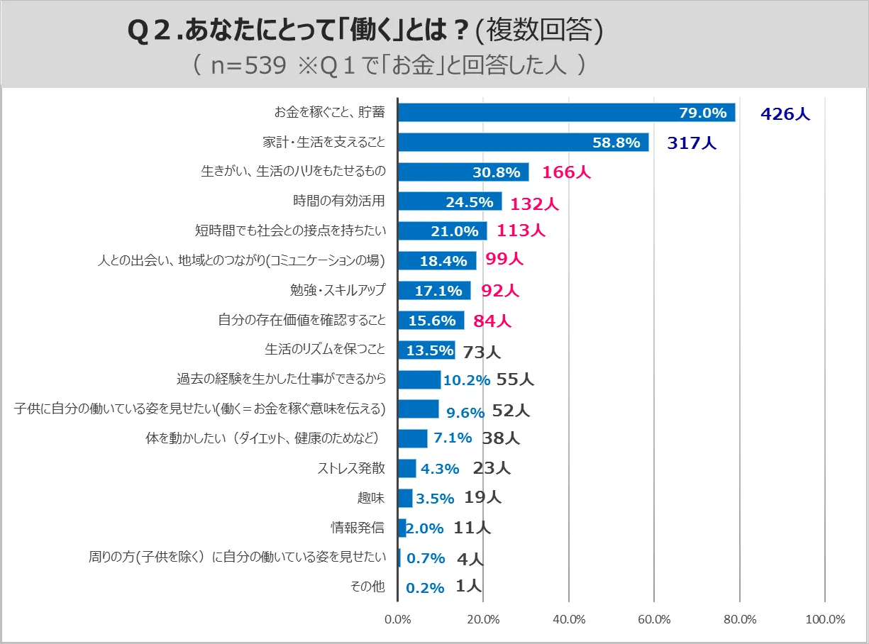 次に、Q1で「お金(家計)」のためと答えた人に、Q1と同じ質問 『あなたにとって「働く」とは?』について、複数回答にしたところ、もっとも多かったのが「お金を稼ぐこと、貯蓄」79.0%に次いで、「家計・生活を支えること」58.8%、「生きがい、生活にハリをもたせるもの」30.8%、「時間の有効活用」24.5%、「短時間でも社会との接点を持ちたい」21.0%、「人との出会い、地域のつながり(コミュニケーションの場)」18.4%、「勉強・スキルアップ」17.1%、「自分の存在価値を確認すること」15.6% とつづきました。 働き方改革の推進とワークスタイルの変革の一方で、「働く」ということに対して、金銭的価値ではない何か「生きがい」、「人、地域社会とのコミュニケーションの場」といったことを「働く」ととらえている回答もみられました。