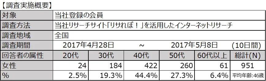 フィールド・クラウドソーシング事業を展開するソフトブレーン・フィールド株式会社(本社:東京都港区、代表取締役社長:木名瀬博)は、当社に登録している女性会員に「女性の働き方」についてのアンケートを2017年4月28日~5月8日に実施しましたので、その結果を報告いたします。 アンケートの対象は、30 代~50 代の主婦を中心とする当社登録の女性会員で、有効回答者数は 951 名(平均年齢46歳)でした。