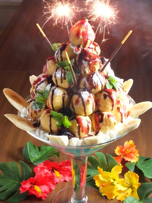 エスニックビストロ パラパでは、青い海をイメージした柑橘系のゼリーの上に、シュー・アイス・フルーツを積み上げ、総重量3kg、高さ50cmのクロカンブッシュにしました。