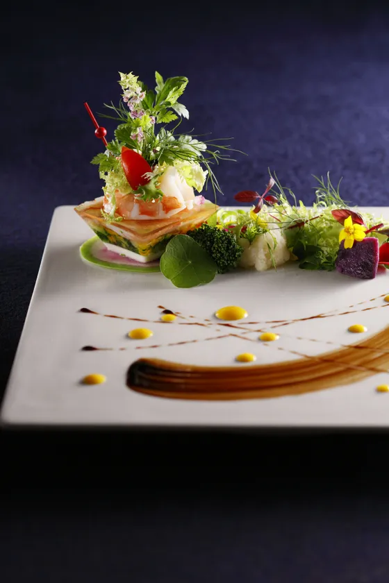 よりお客様のご希望に沿った料理でおもてなしするため、和洋55種類のメニューからオリジナルコースを作り上げるプリフィックスメニューを導入。決められたコース料理ではなく、お客様独自のオートクチュールなコースをご提供できるようになりました。この選べる“ワクワク”感に加え、お客様にインパクトと感動を与えるような遊び心くすぐる演出にもチャレンジ。また、地元の食材をホテルシェフの技とセンスでアレンジしたメニューもさらに進化しました。お食事をより深く味わっていただくためのドリンクは、お好みに合わせて、地酒やカクテルを含めた多彩な種類から料理とのマッチングをご提案いたします。