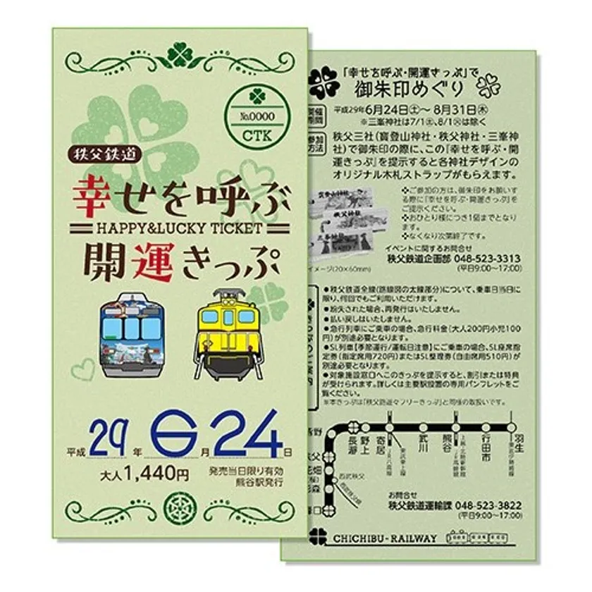 秩父鉄道株式会社(本社:埼玉県熊谷市、代表取締役社長:大谷 隆男)では、多くの参拝客が訪れる秩父三社(寳登山神社・秩父神社・三峯神社)を広く知っていただくため、フルラッピング列車「秩父三社トレイン」を運行しています。そしてこのたび、秩父三社めぐりをよりお楽しみいただけるよう、特別仕様のきっぷ『幸せを呼ぶ・開運きっぷ』を2017年6月24日(土)に期間限定販売を開始いたします。